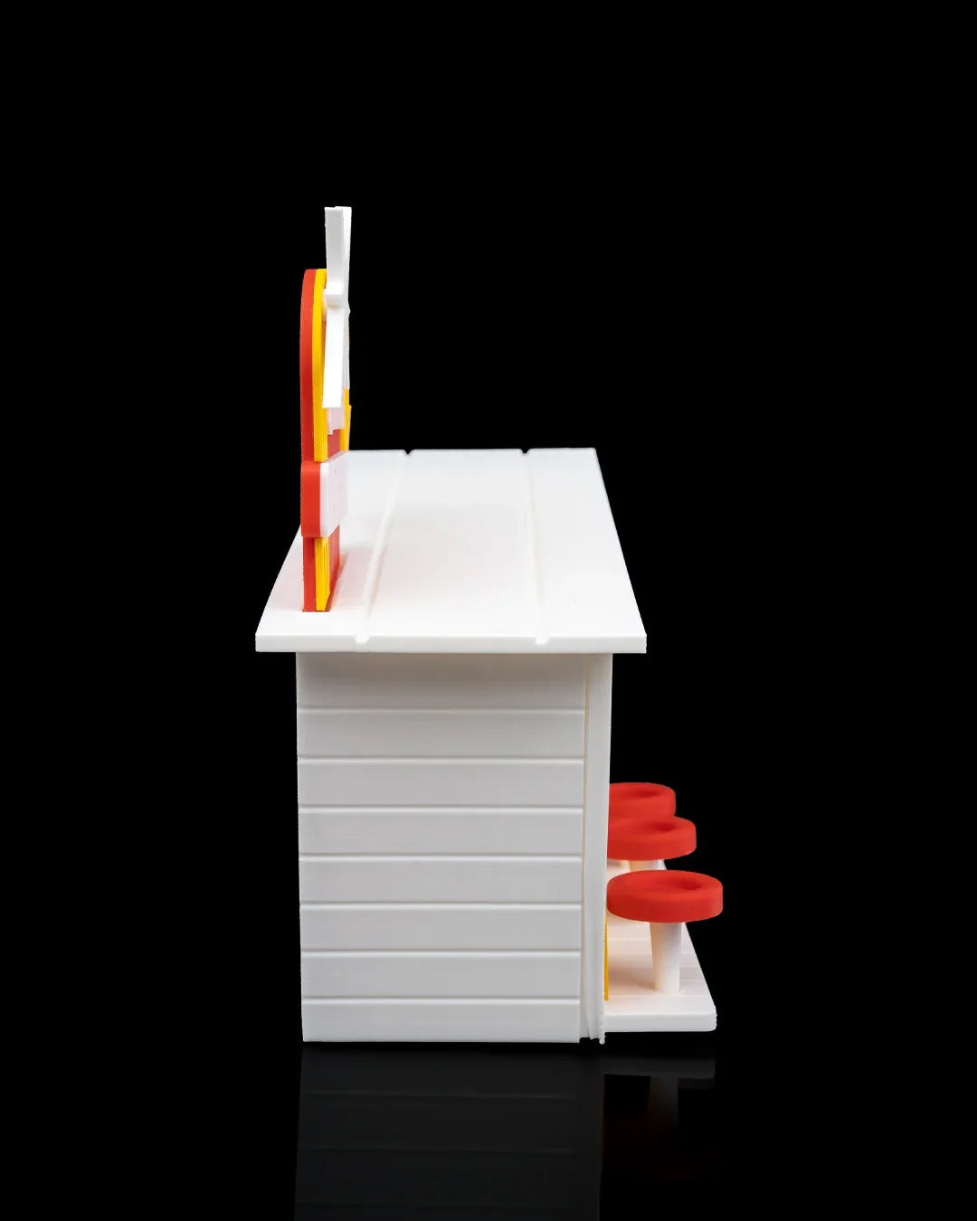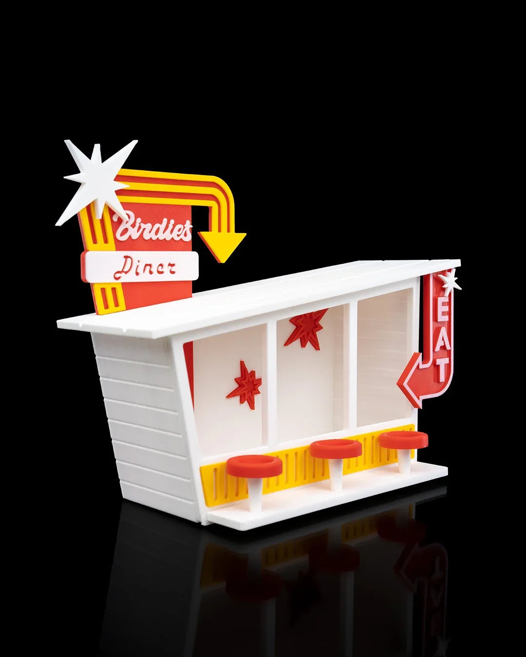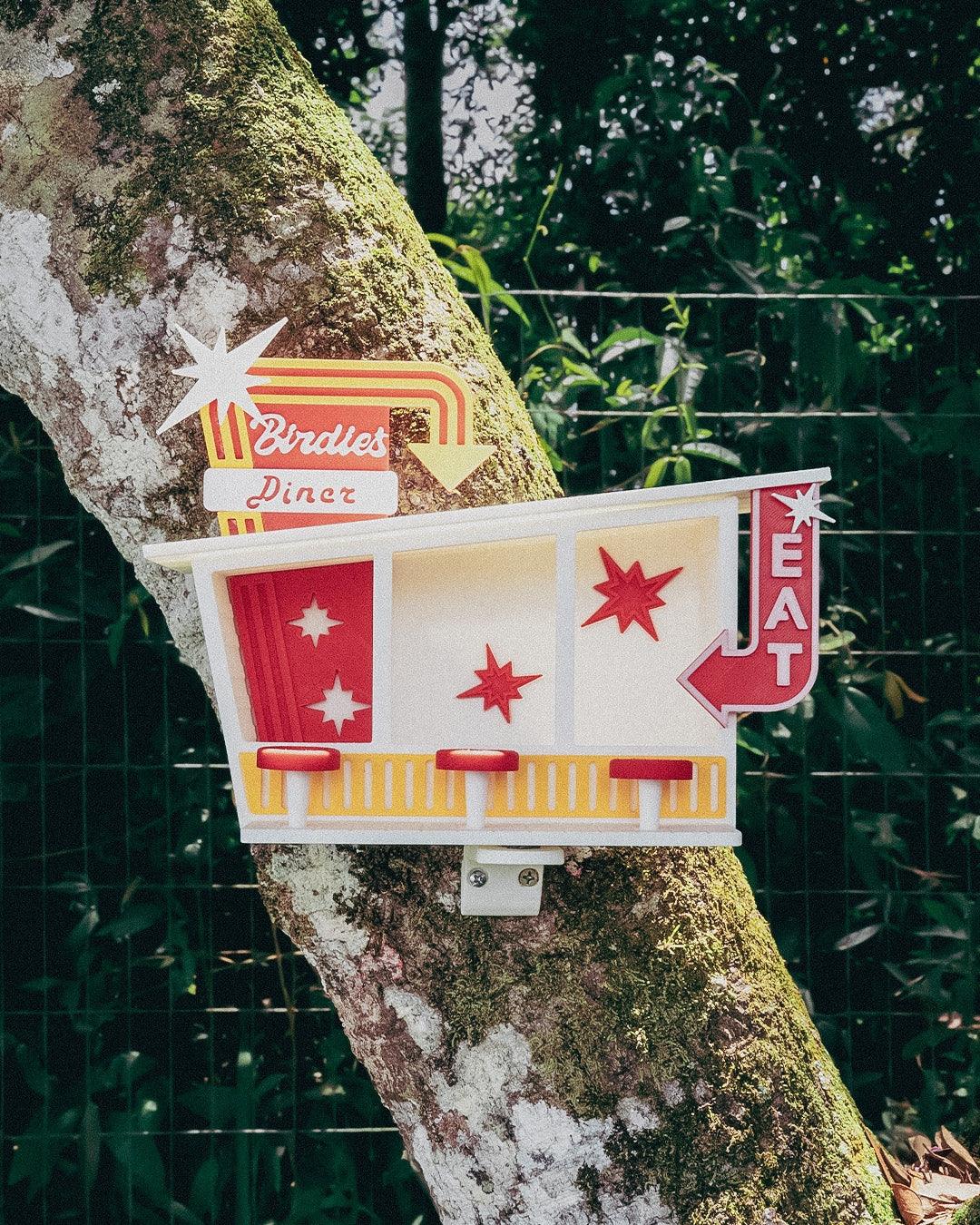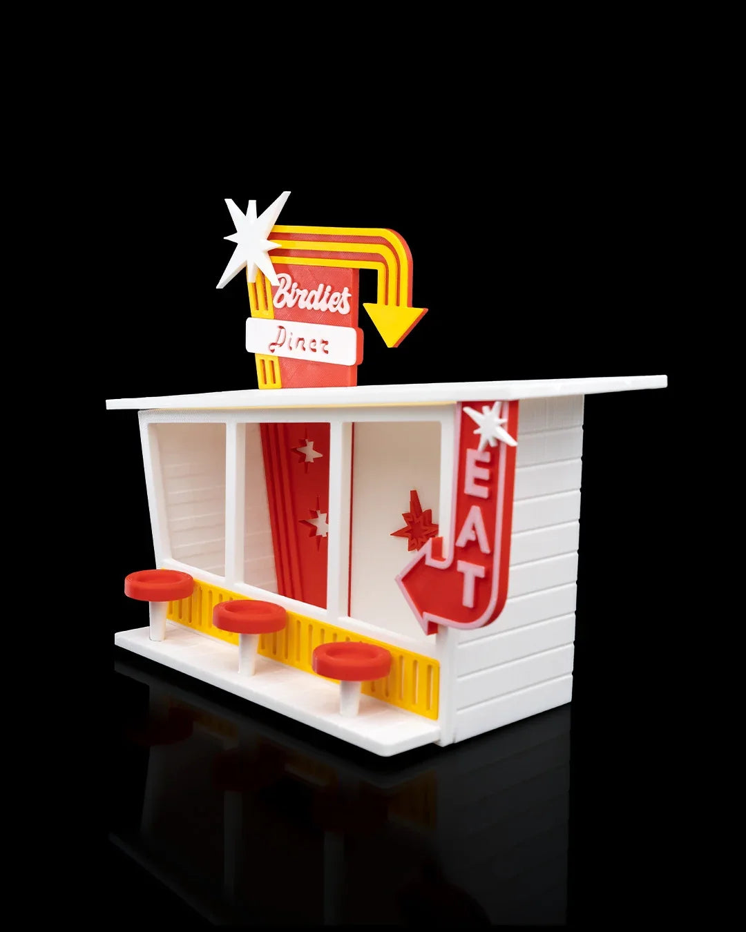 Introducing a charming retro-style bird feeder designed to resemble a 1950s diner. This unique 3D printed outdoor decor adds character to your garden while attracting feathered friends. Perfect for enhancing your backyard with a playful touch.
