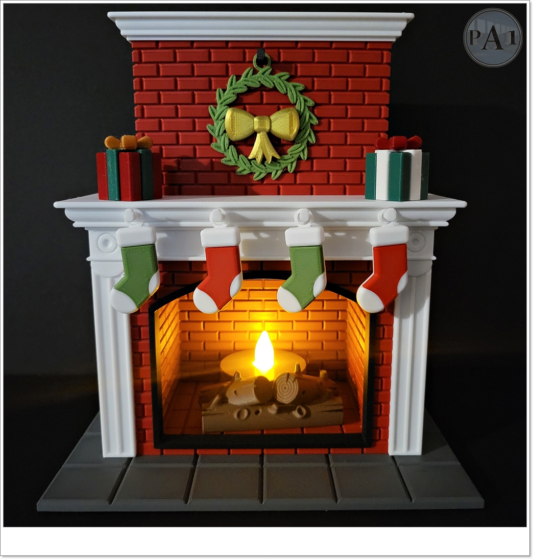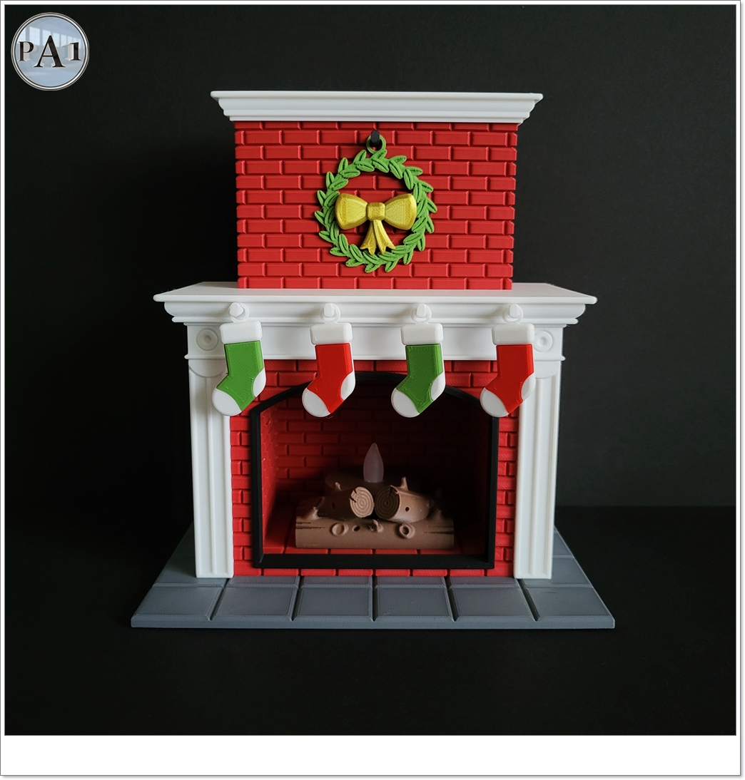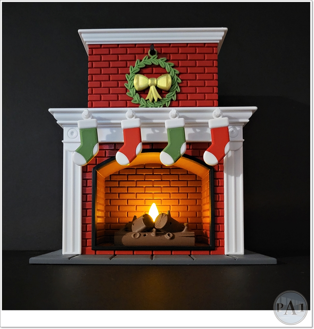 Bring a warm and cozy holiday touch to your home with this Christmas fireplace decor – a beautifully detailed 6-inch 3D printed display complete with a glowing LED flame. Each piece is carefully crafted with multi-color filament and precise layering to recreate the look of brick, wood logs, stockings, and mantle décor. This festive fireplace makes the perfect tabletop accent, mantle piece, or collectible holiday display.