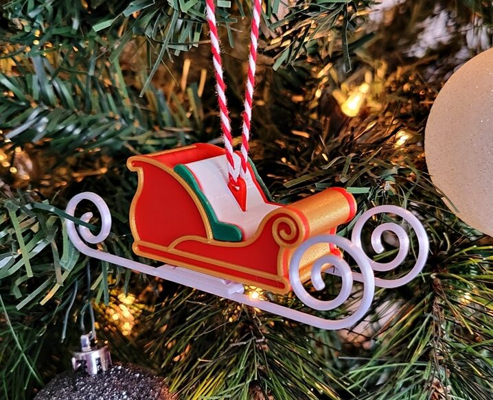 A festive 3D printed Christmas Sleigh Ornament with red, gold, and white detailing. Lightweight, handcrafted, and perfect for trees or holiday displays. Custom colors available.