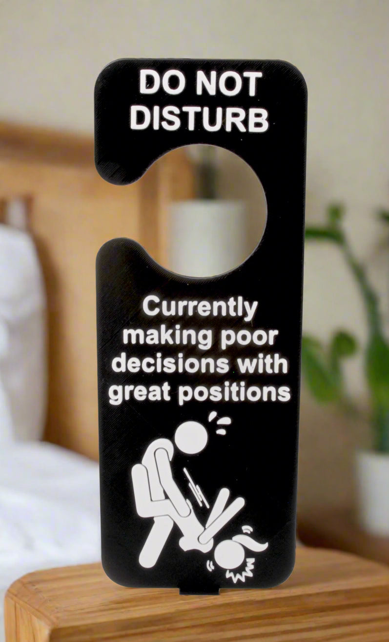 Add a hilarious twist to your privacy with this “Currently Making Poor Decisions with Great Positions” Naughty Door Hanger. Perfect for couples who love to laugh, this cheeky sign makes sure your door says it all without you having to explain a thing.