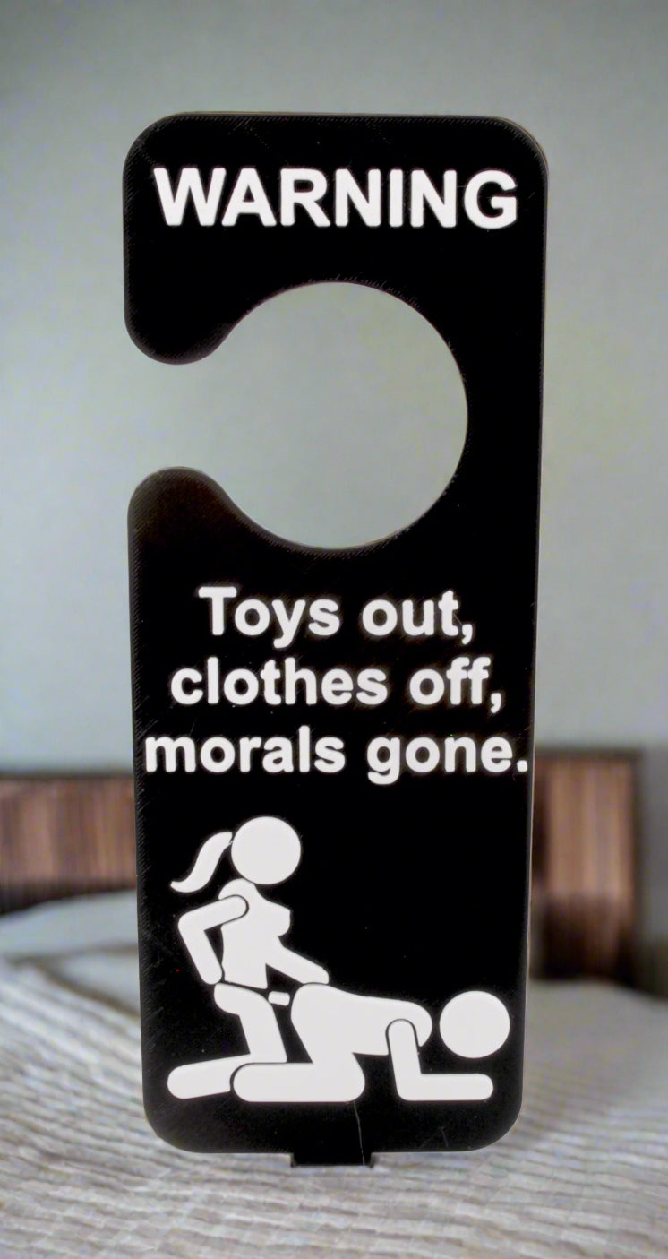 Bring the laughs and set the tone with this cheeky “Toys Out, Clothes Off, Morals Gone” door hanger. Perfect for couples who don’t take themselves too seriously, this adult humor sign is ideal for bedrooms, dorm rooms, or as a gag gift for friends with a wicked sense of humor.