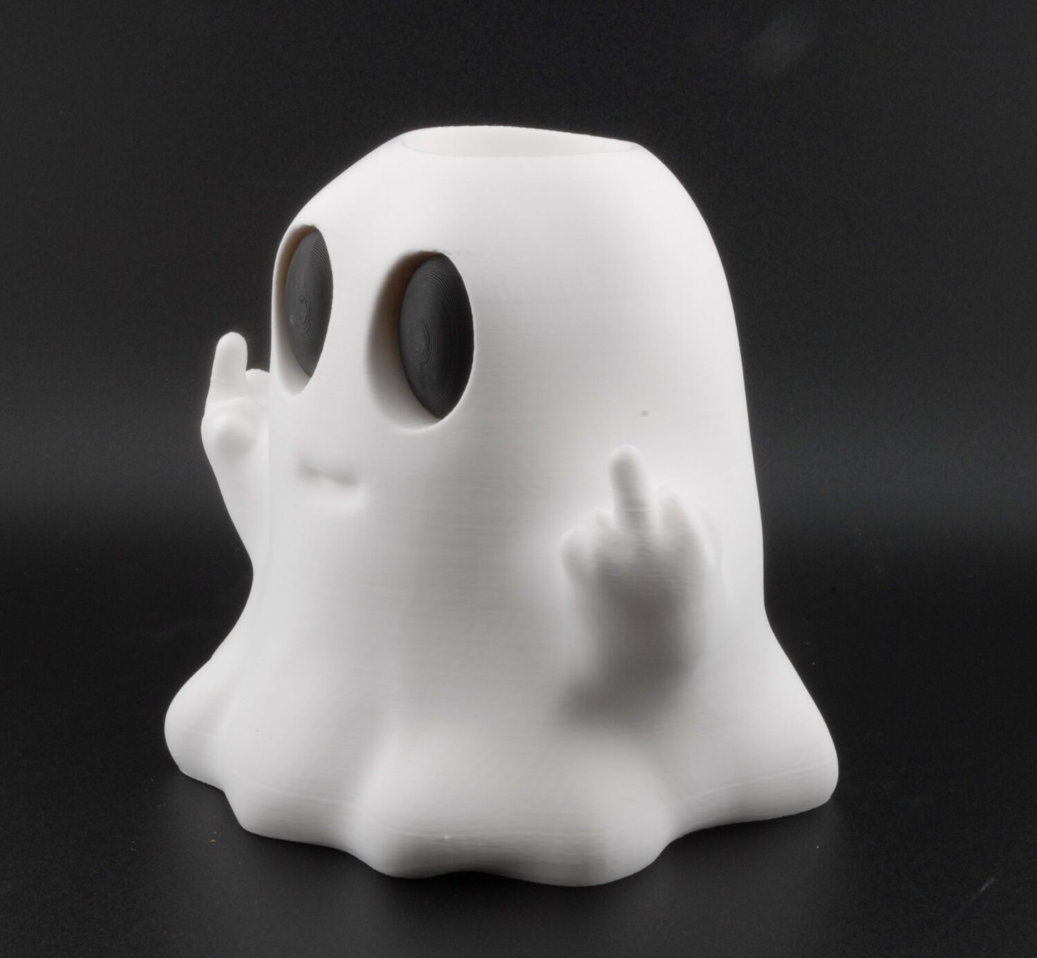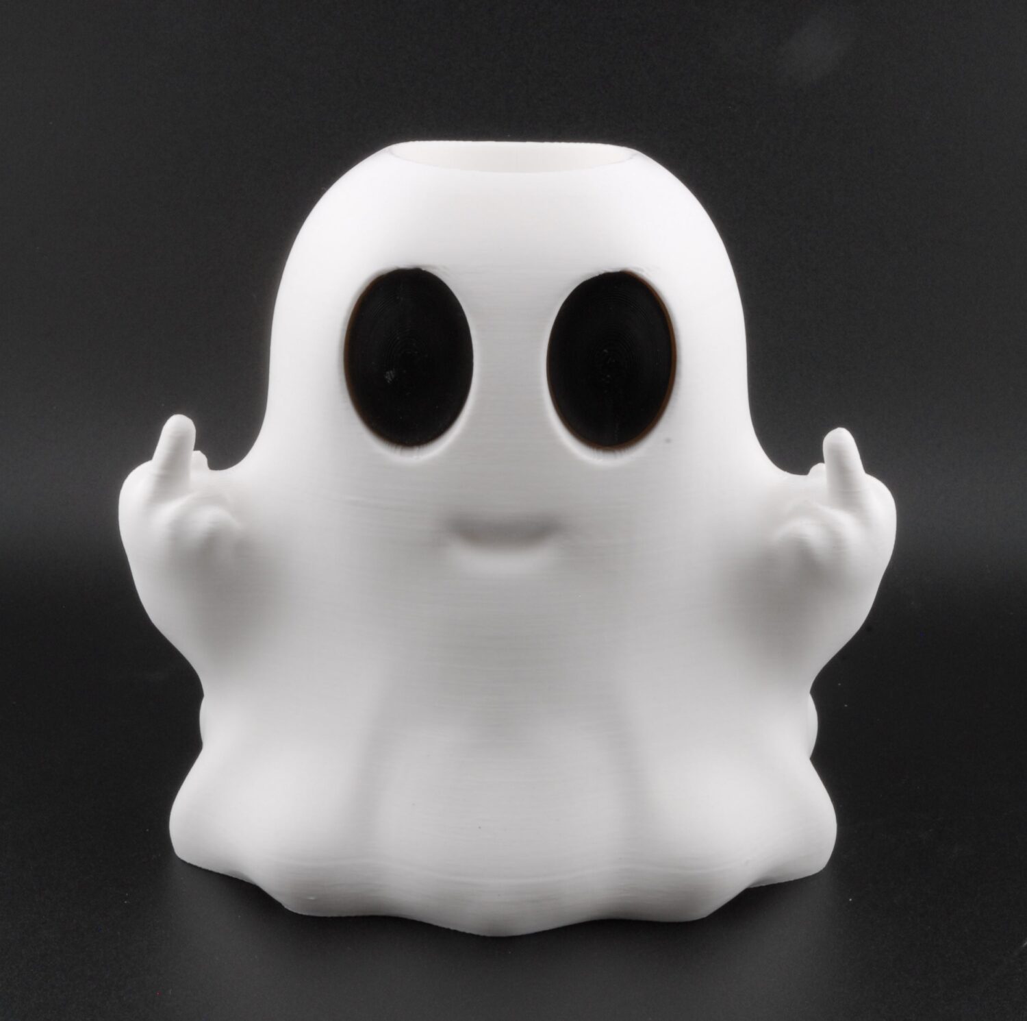 Add a touch of humor to your Halloween decor with this 3D printed ghost candle holder. Standing at 4.5 inches, it features dual LED candles and a playful middle finger design, making it a unique addition to any spooky collection. Perfect for a whimsical display or a conversation starter.