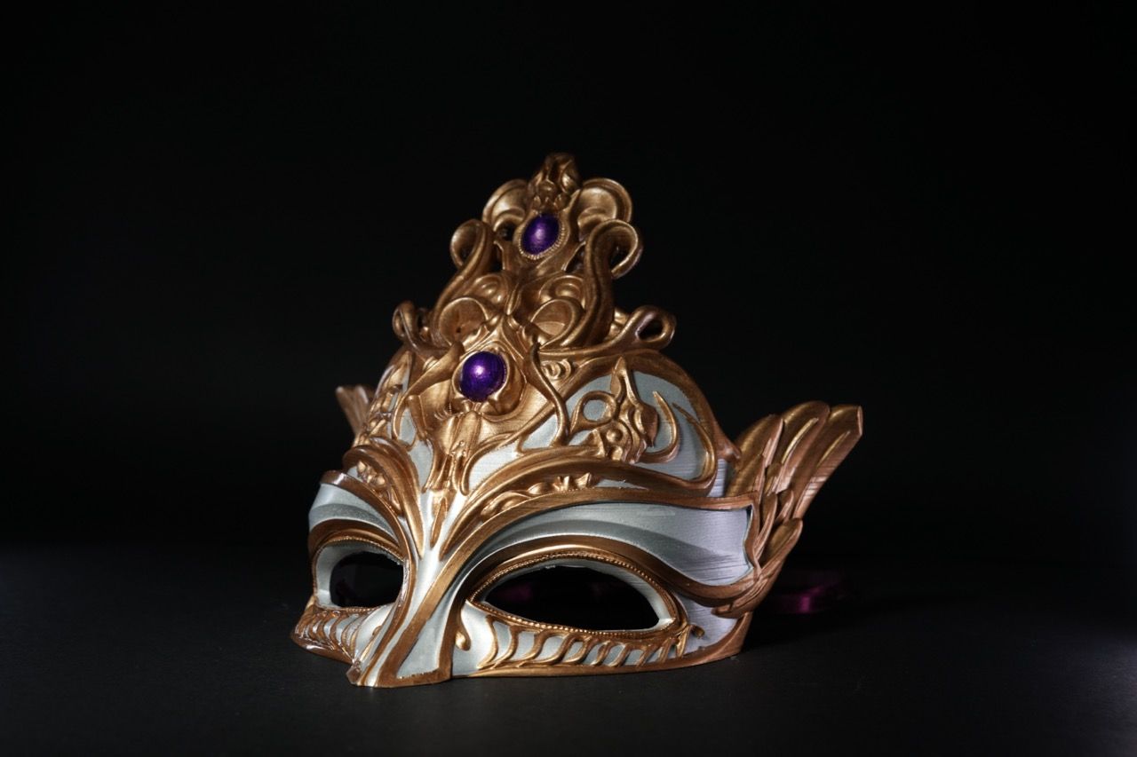 Each mask is 3D printed using multiple filament colors — not painted. The gold and silver tones are achieved through precision filament layering, creating a luxurious finish without any paint. Lightweight yet durable, it’s designed for both comfort and dramatic visual impact.