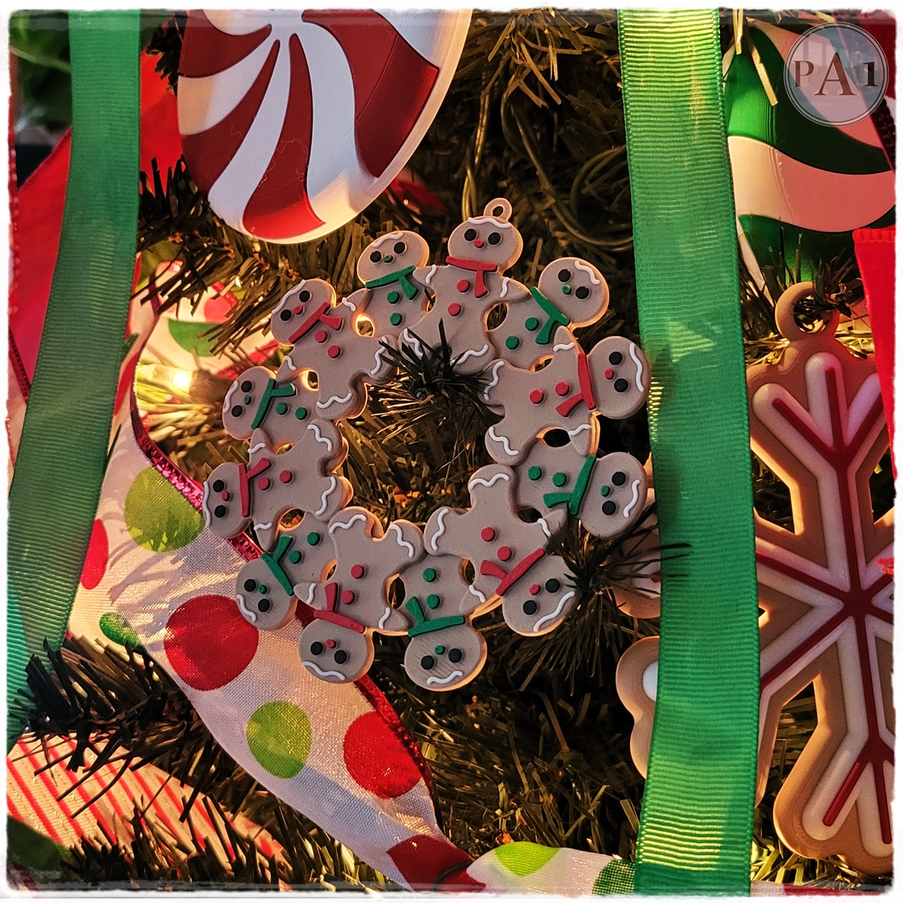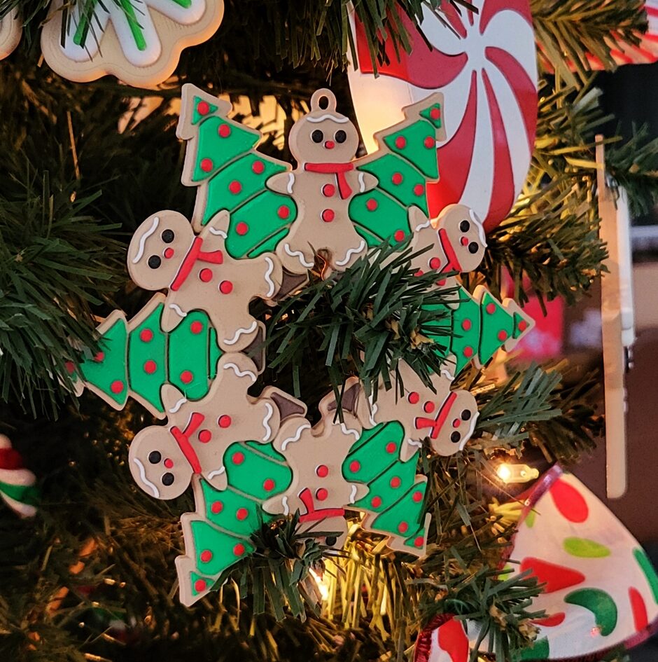 Festive 130mm Gingerbread Wreath Ornament in your choice of all-snowmen or snowmen-and-trees. Lightweight, detailed, and fully 3D printed—perfect for holiday decorating. Custom colors available upon request.