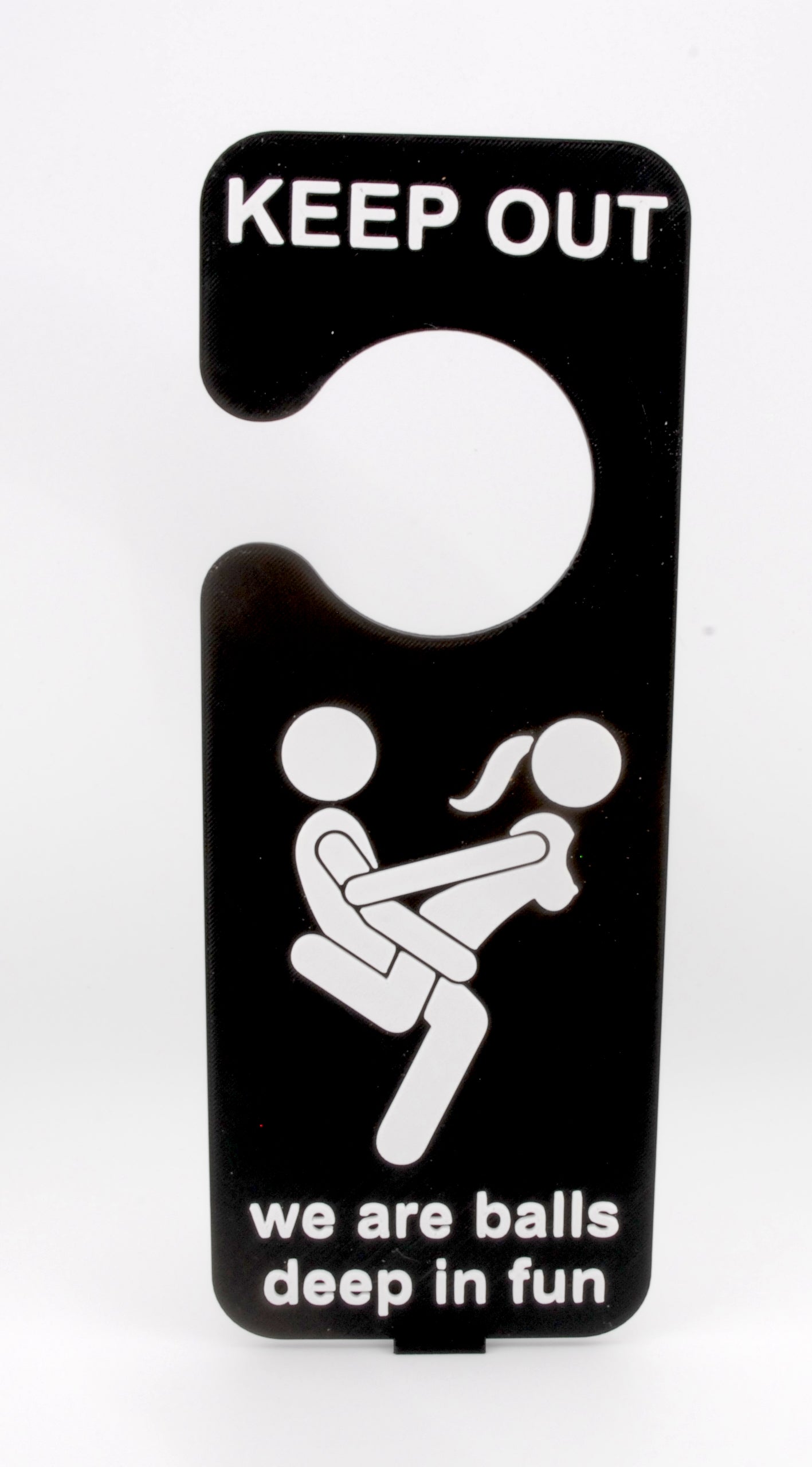 Each door hanger is 3D printed from durable, lightweight plastic and designed to fit most standard door handles. It’s just one of many funny and risqué styles we offer, so you can collect them all for every mood and occasion! Check out our full collection of humorous door hangers for even more unique designs.