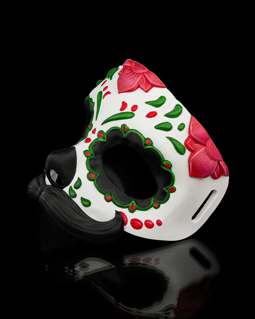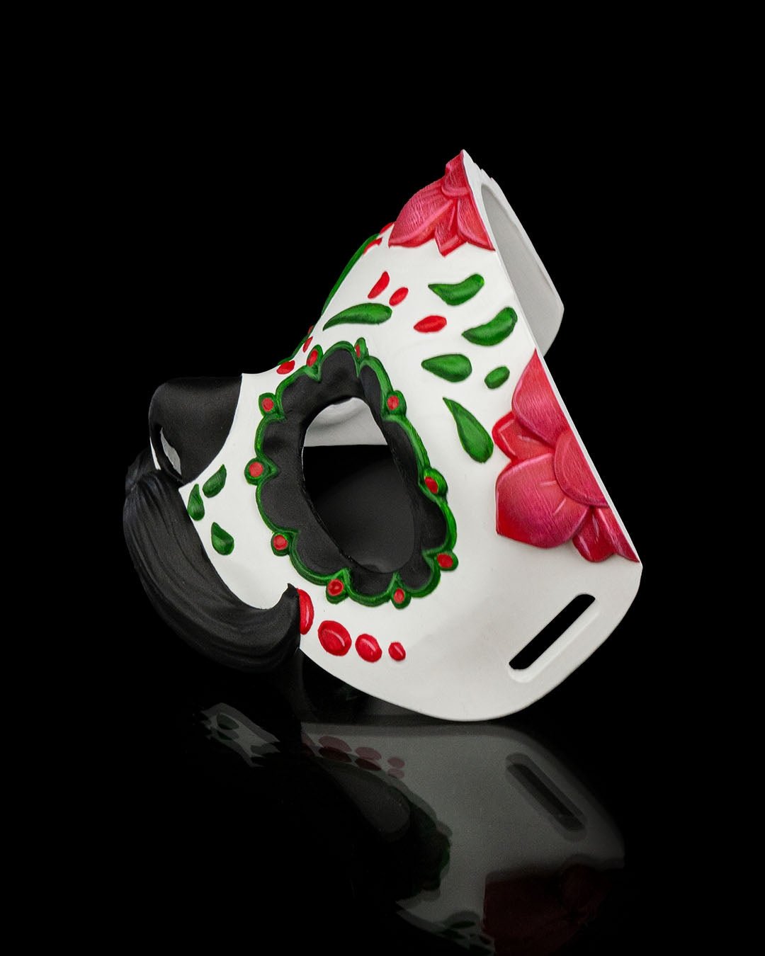 Celebrate Día de los Muertos in bold style with the Mustache Calavera Mask — a detailed sugar skull design brought to life through high-quality 3D printing. This mask features traditional red and green floral accents, black eye outlines, and a sculpted mustache for a fun twist on the classic calavera look.