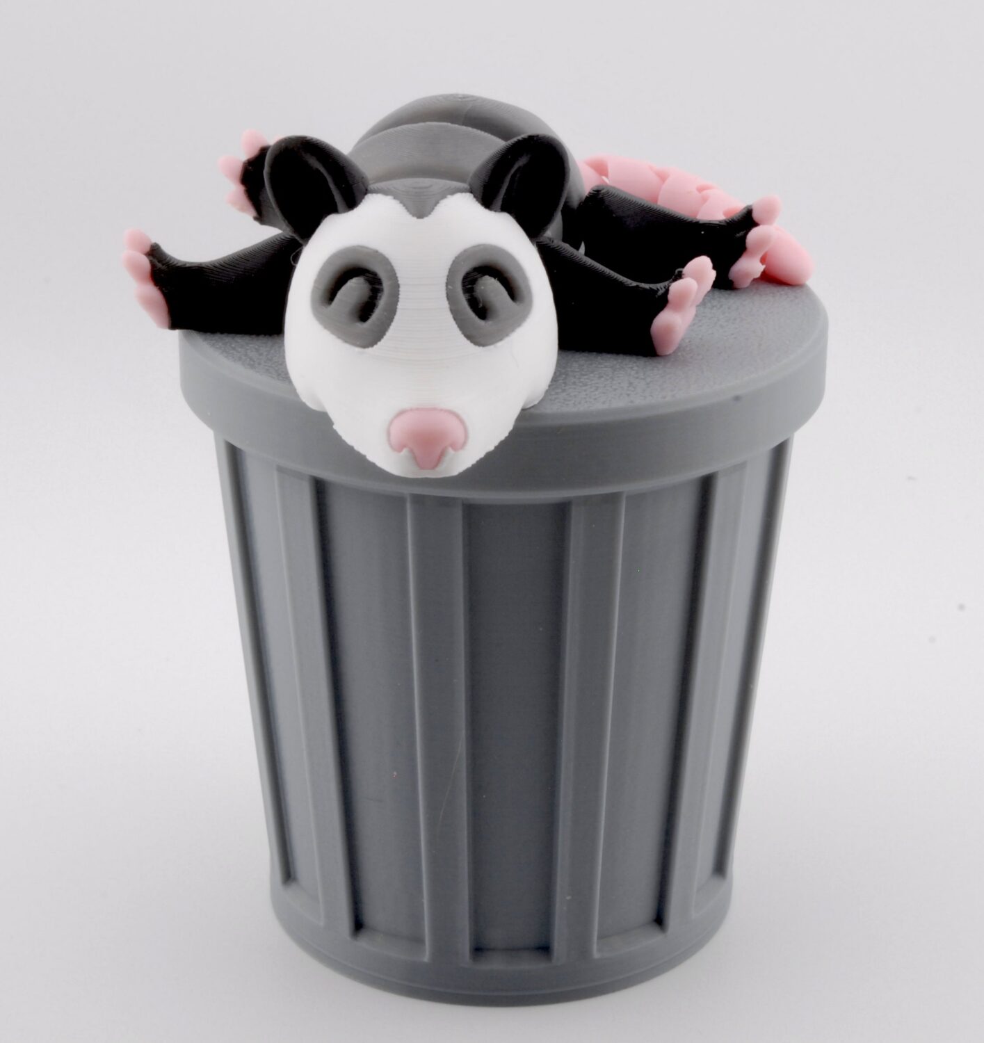 Ollie is articulated, so you can pose him however you like — sprawled on a lid, lounging in a dumpster, or hanging out with his fellow trash pals. Each one is printed in multi-color PLA (not painted) with fine details, including his pink paws, curled tail, and curious face.