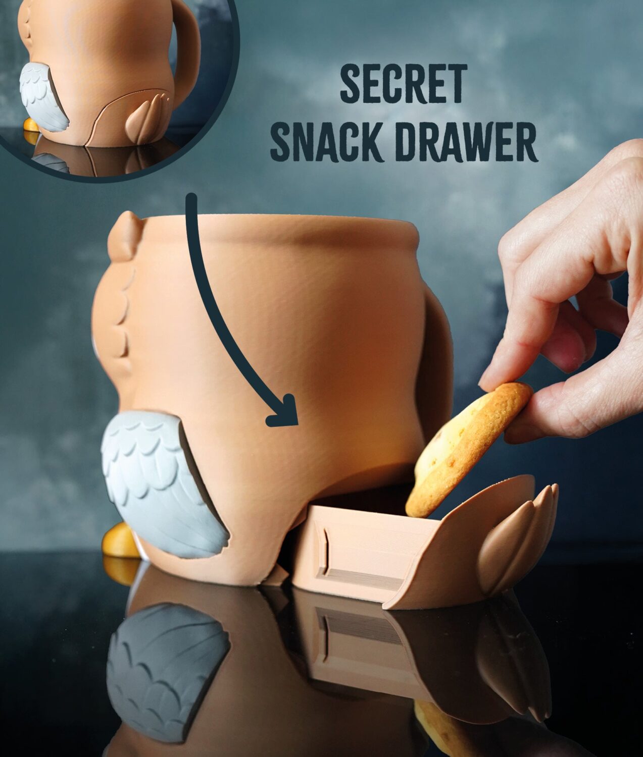Each Owlfonso features a cozy, owl-shaped design that fits a standard pint container perfectly. His wings double as spoon holders, and he even hides a secret snack drawer for cookies, candies, or toppings!