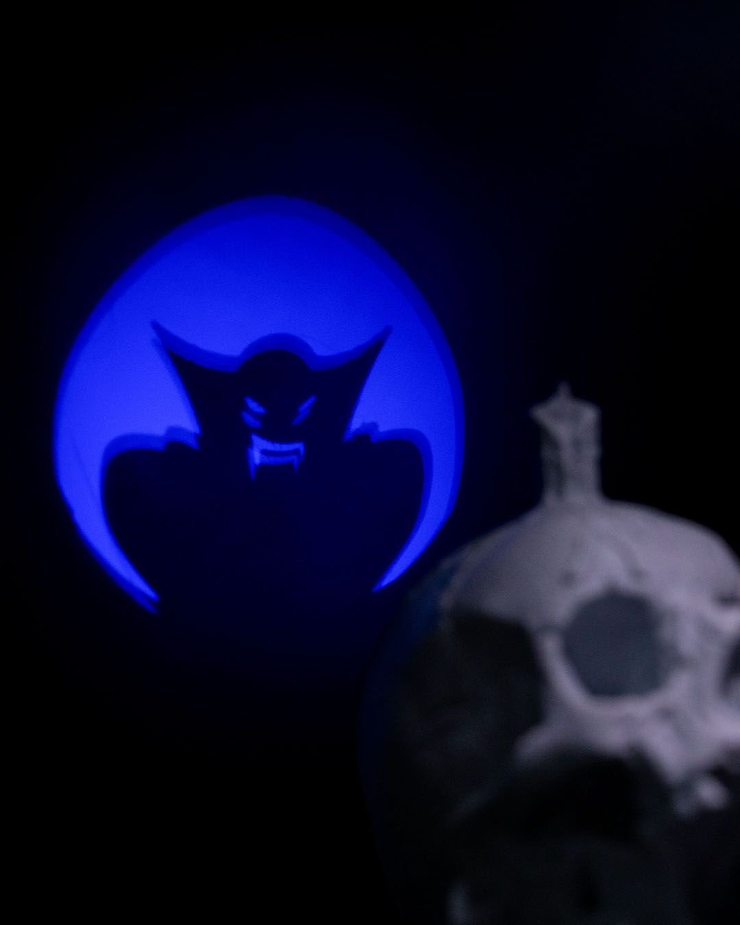 Bring a haunting glow to your Halloween nights with the Skull Candle Halloween Light. This 6-inch tall design combines a skeletal skull base with melted candle detailing for an eerie gothic effect. When lit, it casts chilling projections — including a shadowy vampire silhouette — onto nearby walls.