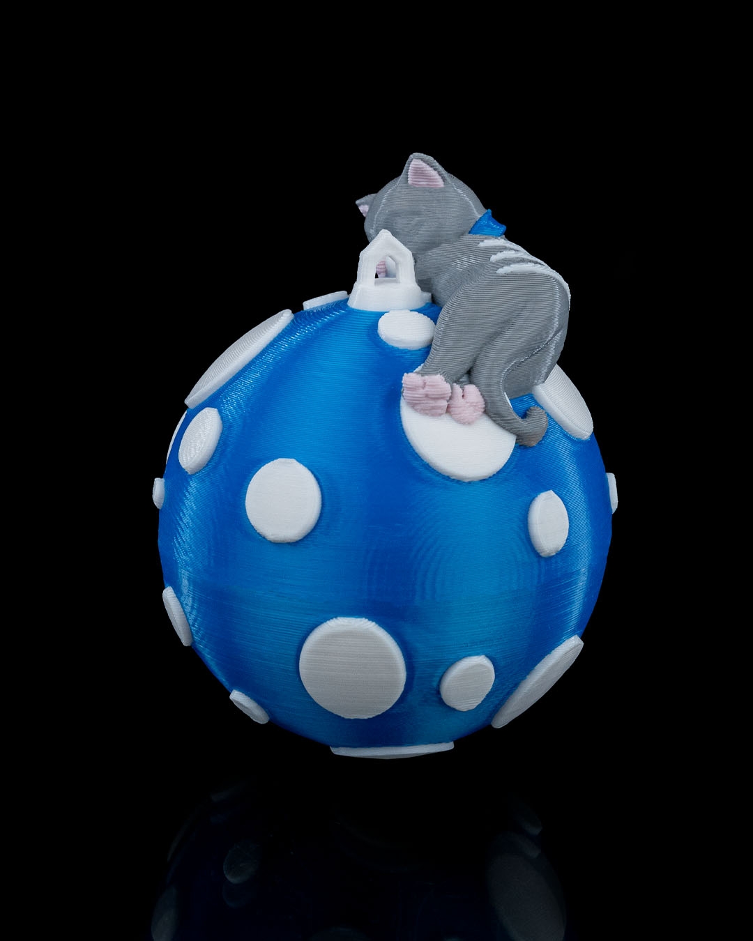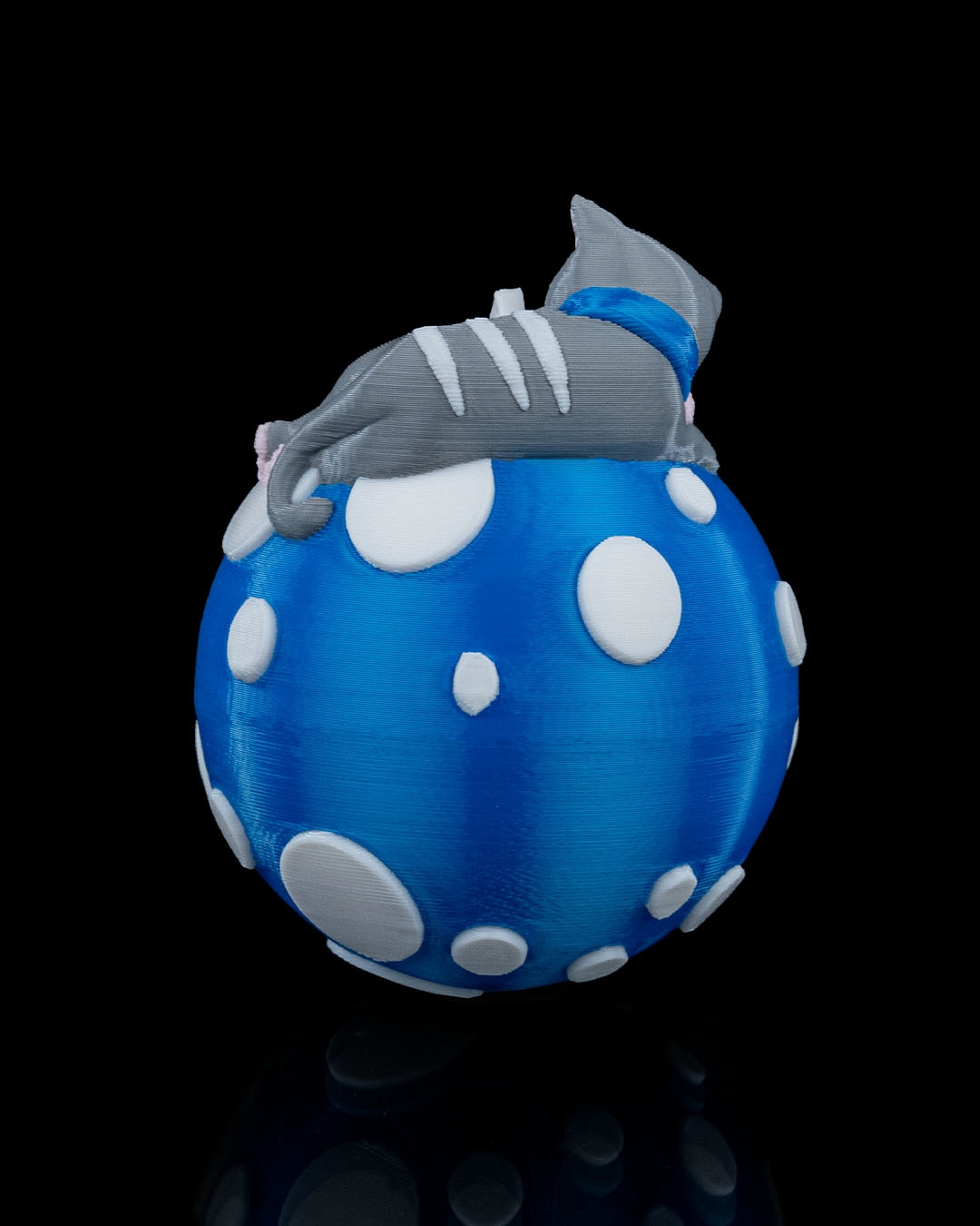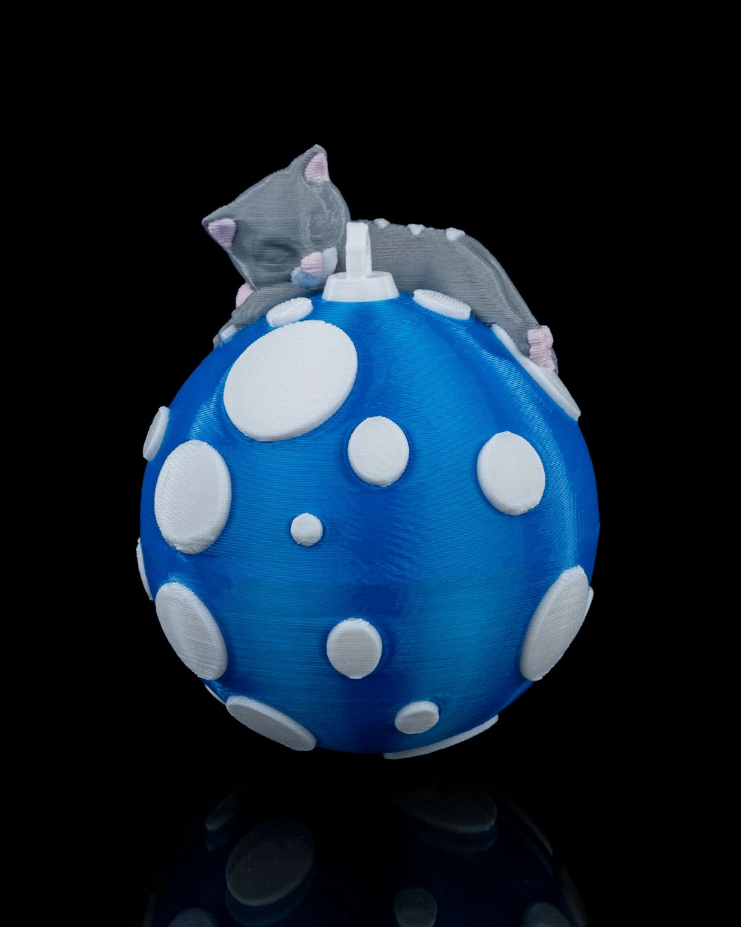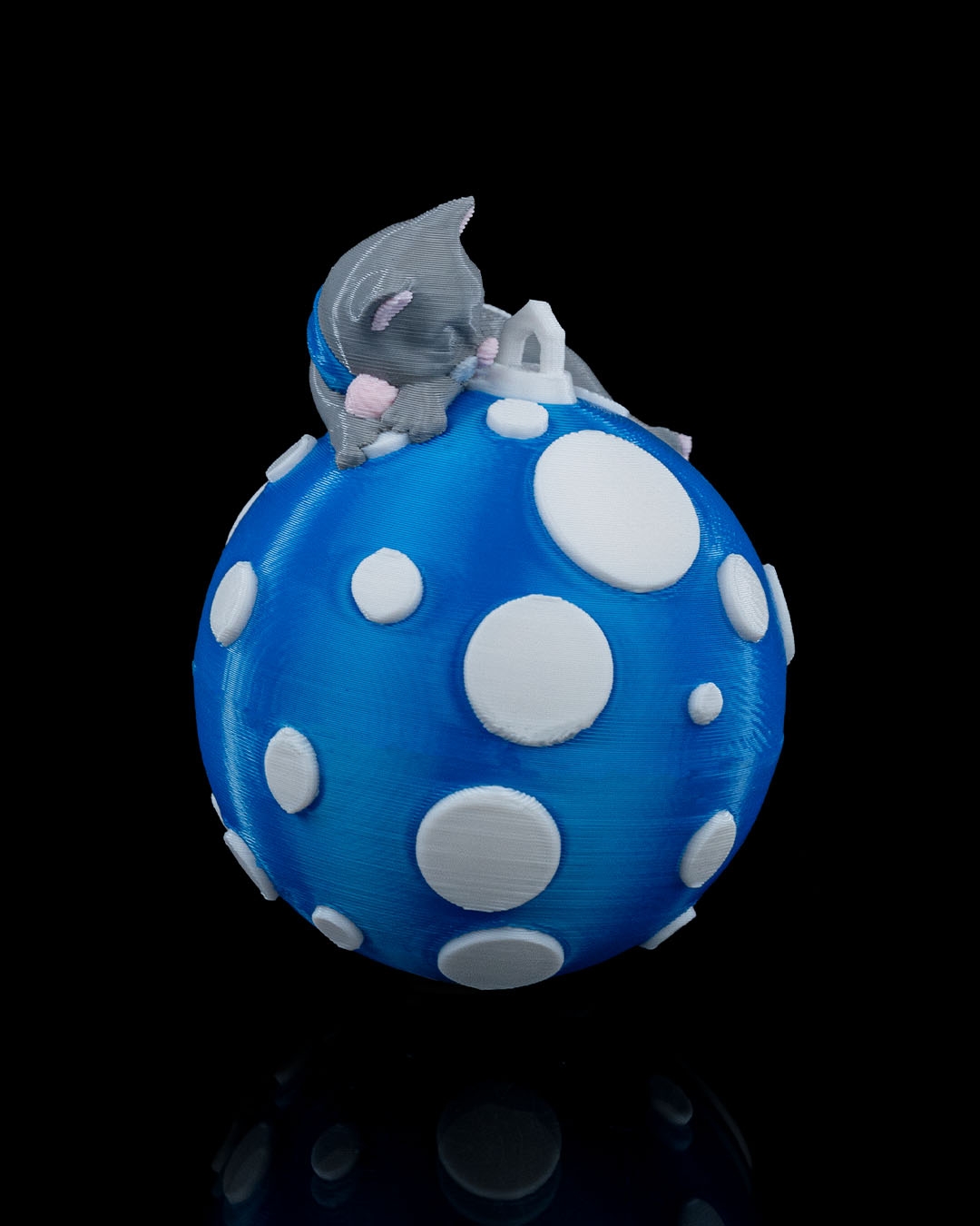 Each ornament is crafted using high-quality PLA on our professional multi-color 3D printers, ensuring vibrant coloring and smooth, crisp details with no painting required. The design features a sweet gray cat curled up on a bright blue ornament covered in raised white dots, creating a playful snowy look that stands out beautifully on any Christmas tree. Lightweight and sturdy, this ornament hangs easily without bending branches and is ideal for both real and artificial trees.