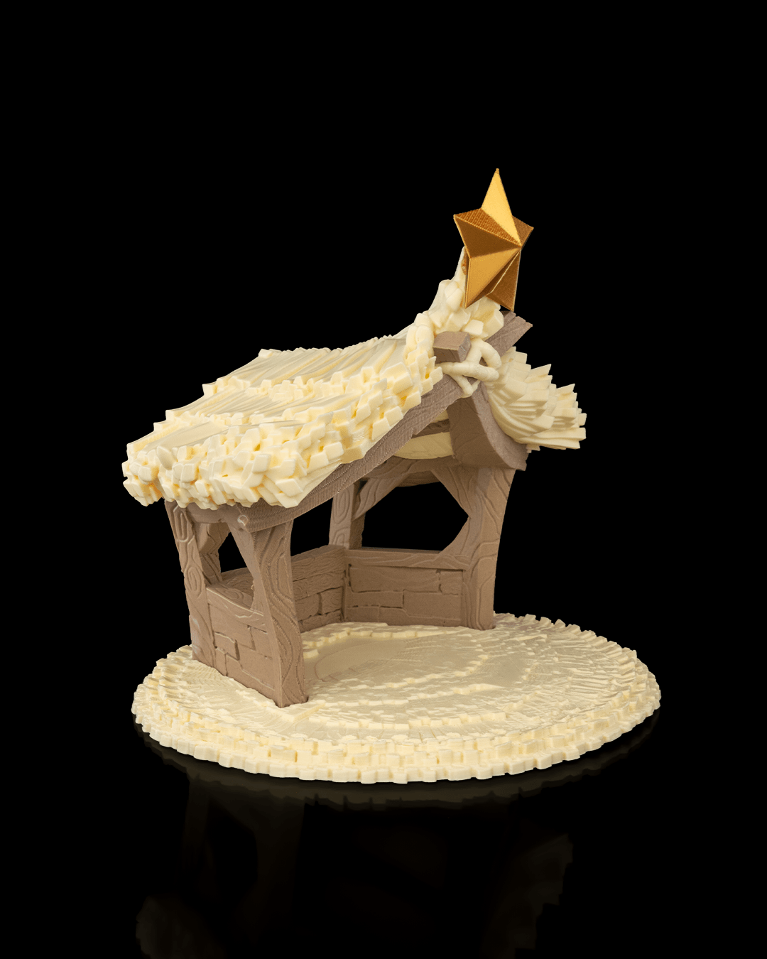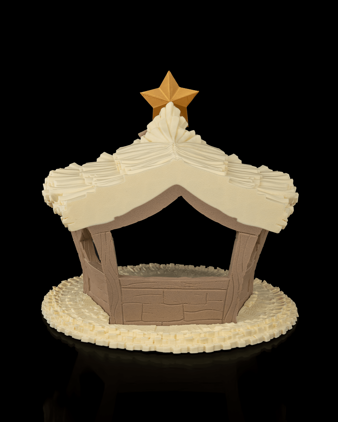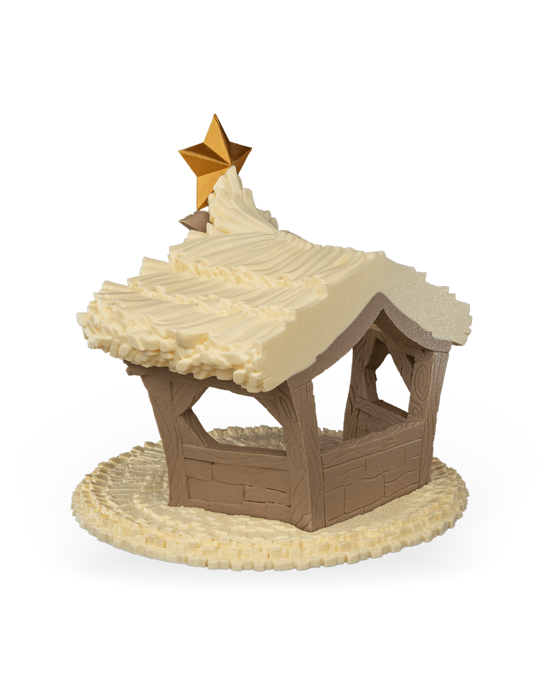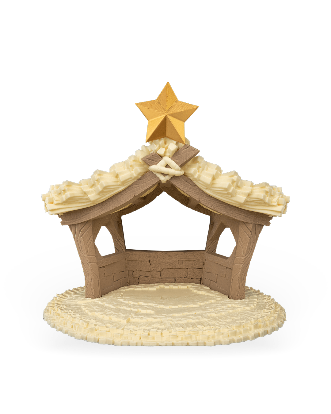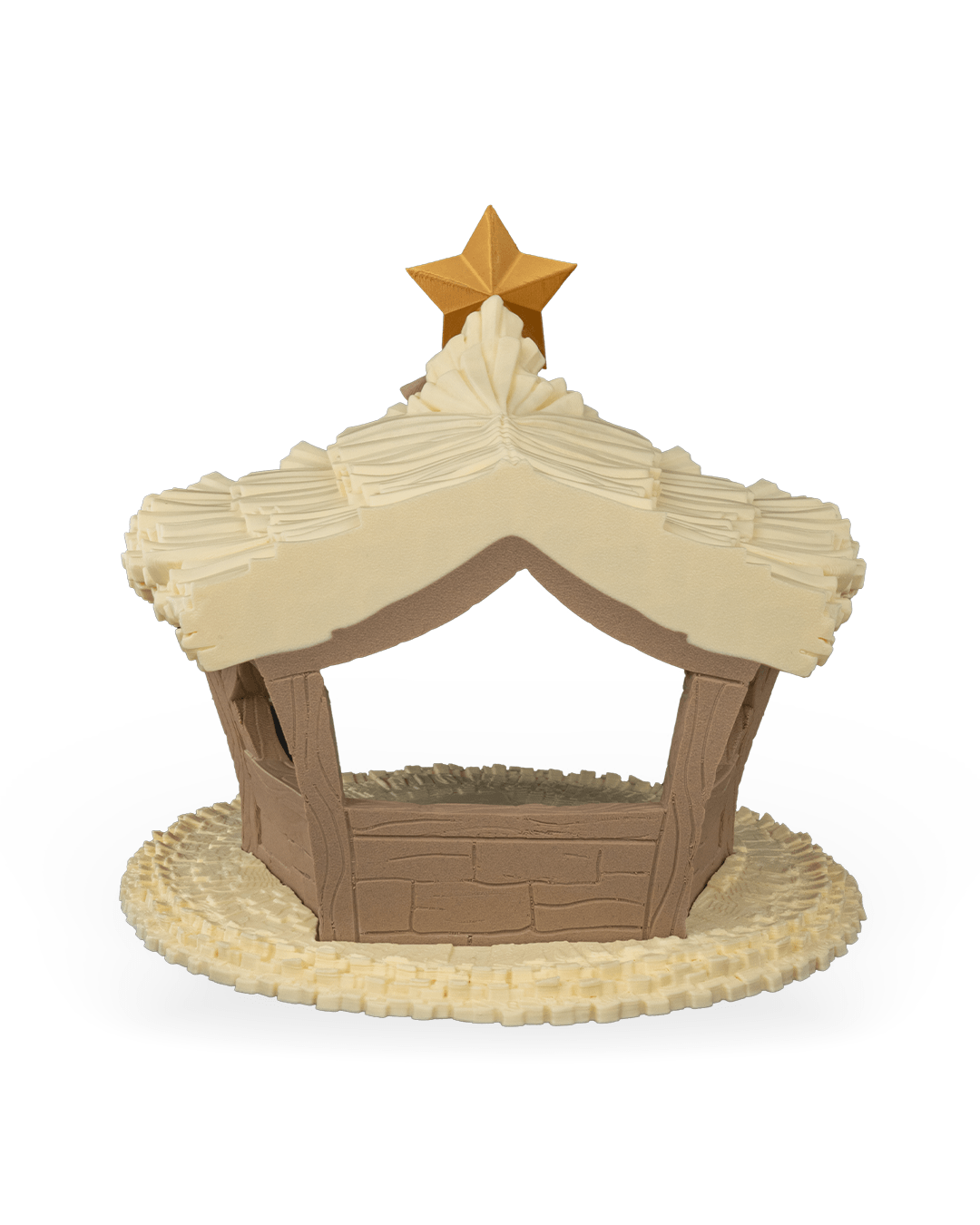 A 15 cm 3D-printed Starry Hut Nativity Display. Choose between Hut Only or the Full Nativity Set with all shown figures included.