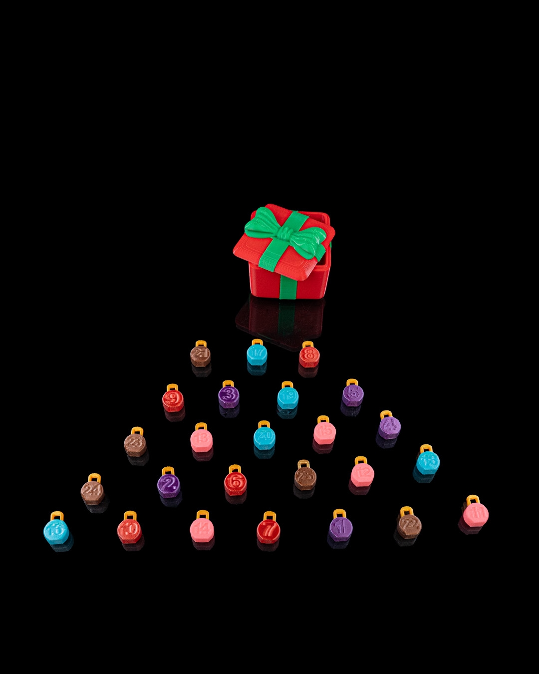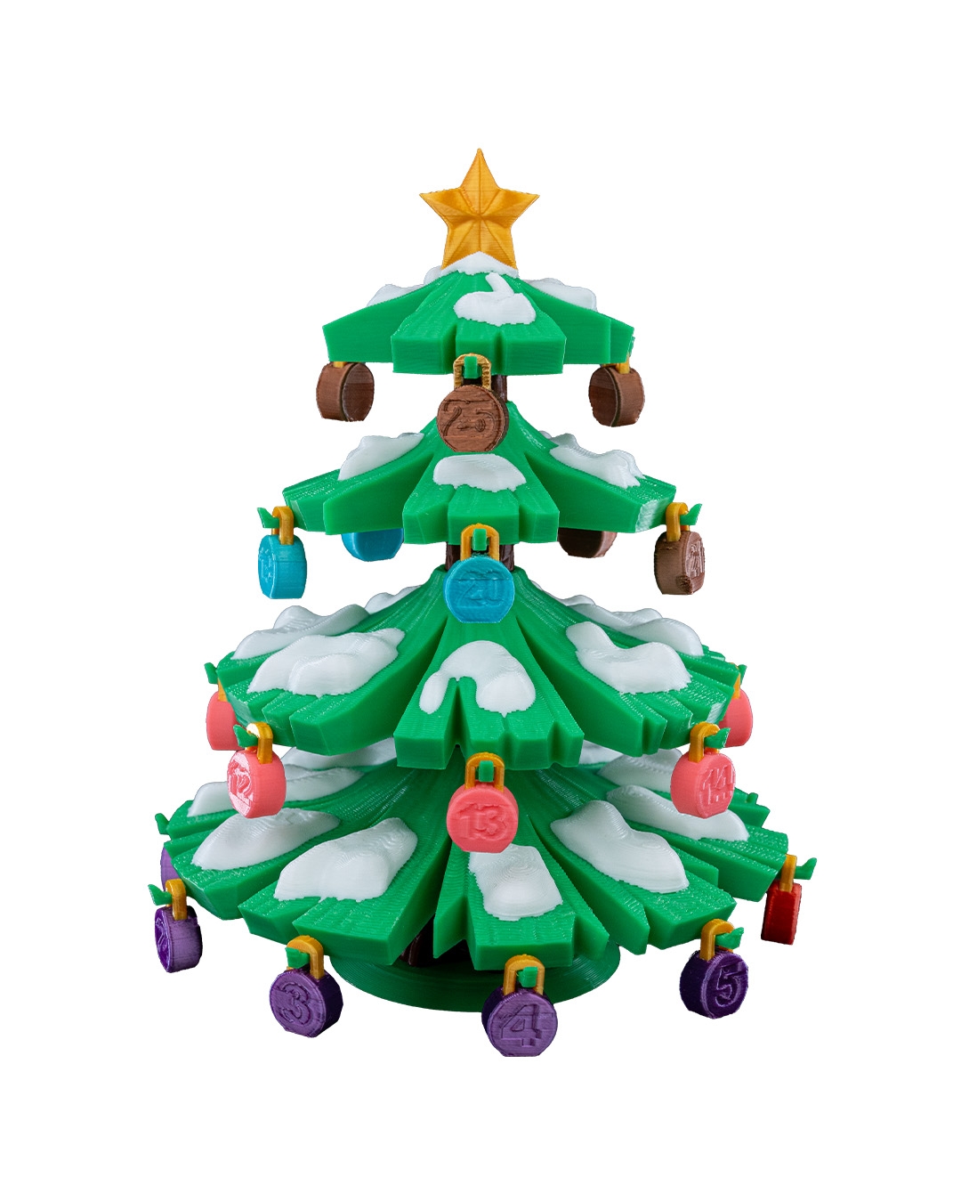 A festive 16cm Christmas countdown tree with 25 numbered ornaments and three matching storage gift boxes. Fully 3D printed, reusable each year, and available in custom colors upon request. Colors may vary due to filament availability and screen settings.
