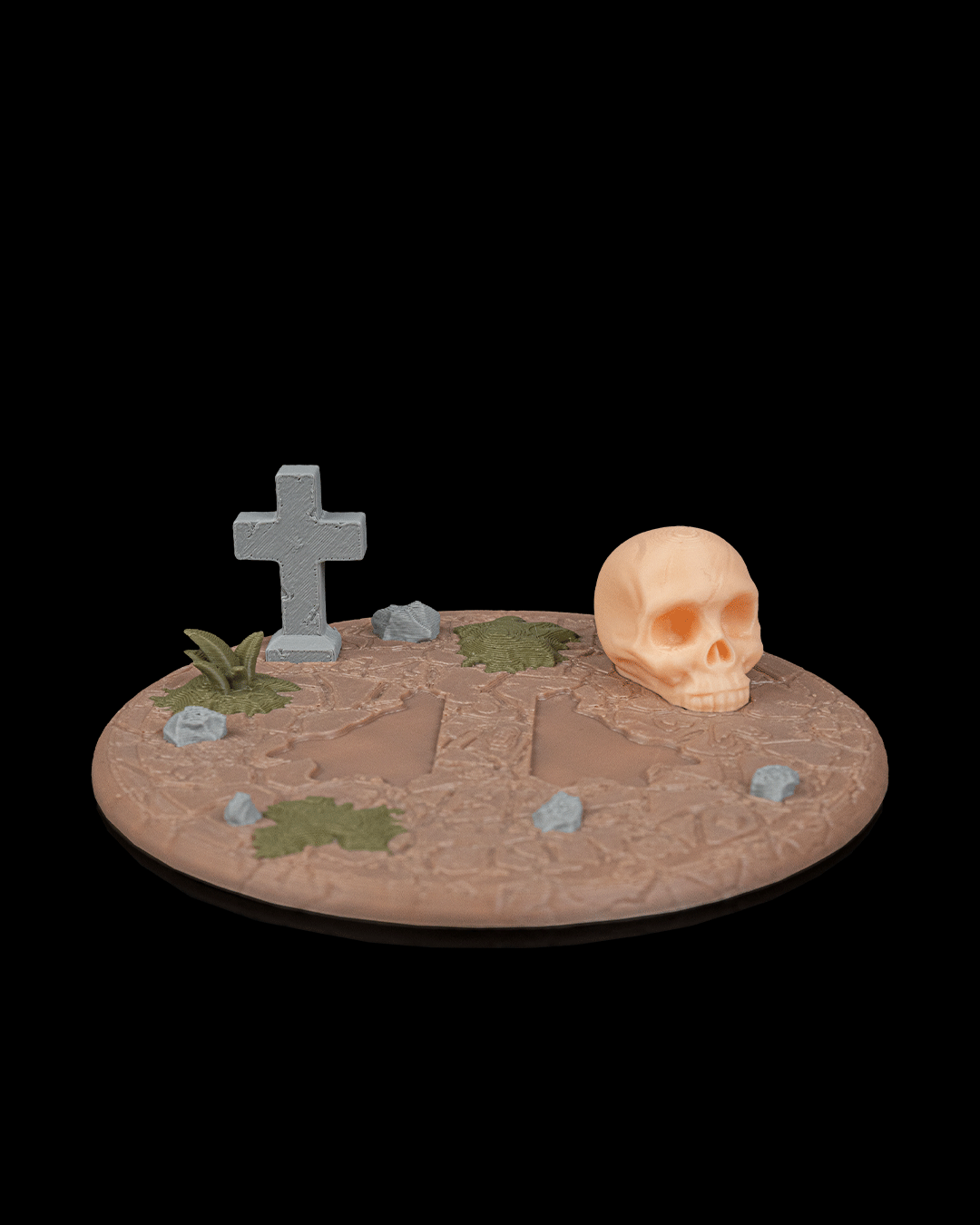 Hand-crafted with precision 3D printing, this gothic-style figurine is bursting with personality, from his stitched wings to his wide-eyed expression. Display him on his graveyard-inspired base (with skull and cross details) for maximum effect, or let him stand solo as a quirky collectible.