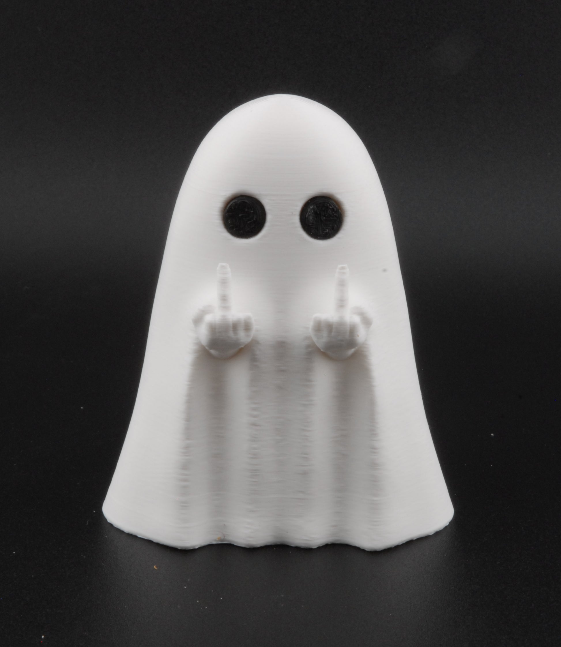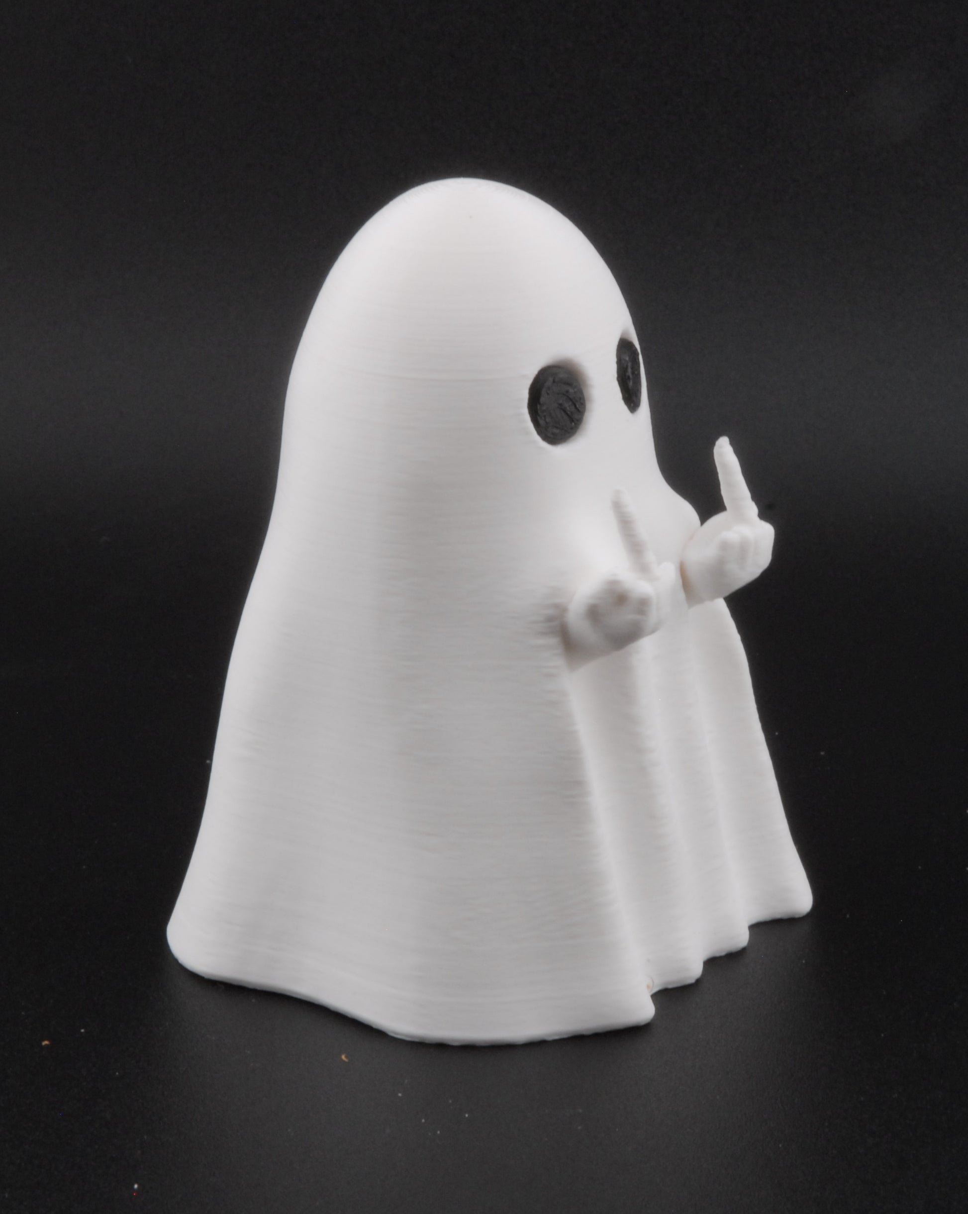 Meet the boldest ghost on the block! This 3-inch 3D printed ghost figurine makes the perfect mix of spooky and funny Halloween decor. With its arms raised in a cheeky middle-finger pose, this solid ghost statue is a hilarious twist on classic ghost decorations.